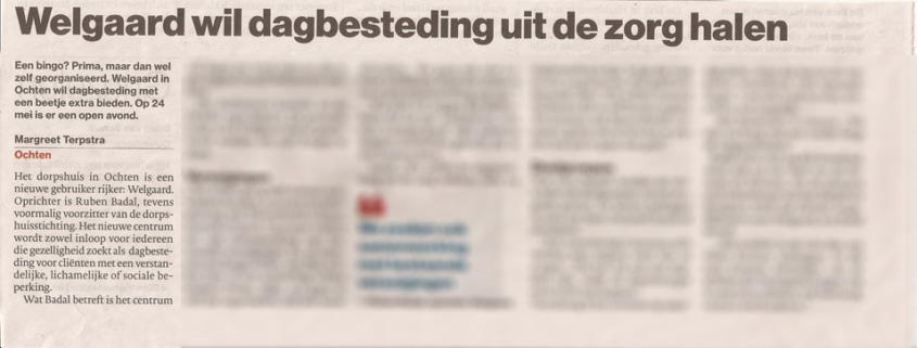 ‘We willen dagbesteding uit de zorg trekken’, zegt Ruben Badal, oprichter van Welgaard. Margreet Terpstra schreef een artikel over het concept van Welgaard en onze visie op dagbesteding. Het volledige artikel staat in de Gelderlander van 25 mei 2018.